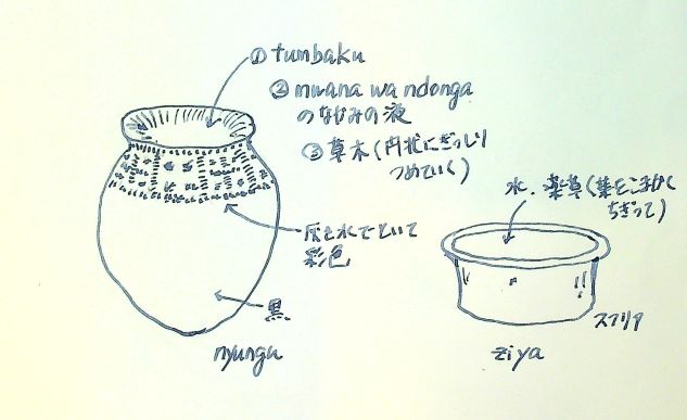 今後は、壺のkudzifukiza105と、chizaのkoga106を7日間朝夕小屋の中で行う。 7日が過ぎると、中身は自分たちで捨ててしまってもよい。 それが済むと束ねられた植物の枝や根(「飲むための薬草(mihi ya kunwa9)」)を ku-jita107して飲む。