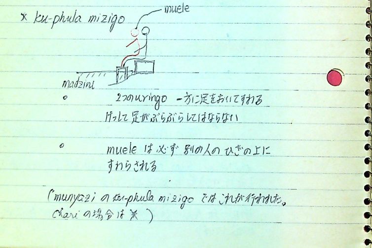 水辺にはこの日の目的のために木の枝を組んで作ったウリンゴ(uringo79)と呼ばれる台が設置されている。そこで運んできた重荷を下ろし、ウリンゴに座らされた患者=シェラに対して赤い(褐色の)雄鶏と赤いヤギが供犠される。施術師ごとにやり方に違いはあるが、ウリンゴの設置とそこでの患者の座らされ方の基本は下記の図のとおり。